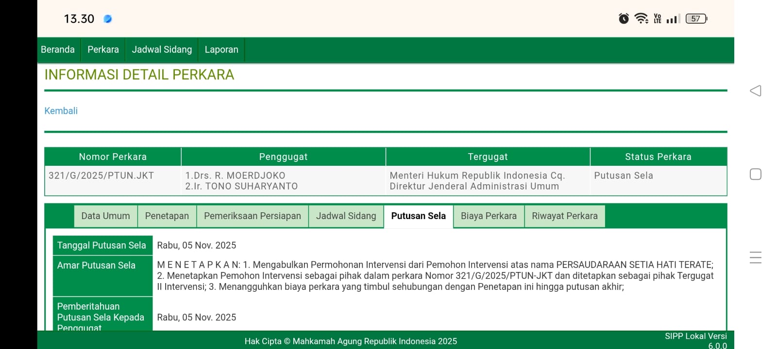 Majelis Hakim Pengadilan Tata Usaha Negara (PTUN) Jakarta mengabulkan permohonan Persaudaraan Setia Hati Terate (PSHT) untuk menjadi pihak intervensi dalam perkara nomor 321/Pdt.G/2025/PTUN.JKT atas gugatan yang diajukan oleh Drs. Moerjoko H.W dan Ir. Tono Suhariyanto terhadap Menteri Hukum Republik Indonesia.